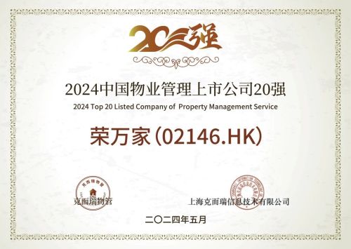 5月22日,2024中国房地产及物业上市公司测评成果发布会暨ESG发展高峰论坛在深圳举办。会上,荣万家生活服务股份有限公司荣获“中国物业管理上市公司20强”第19名。
