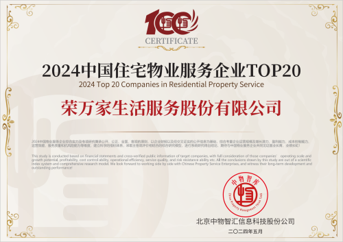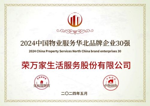 5月8日,由北京中物智汇信息科技股份公司(中物智库)主办的“守正待时 共赴美好”2024 中国物业综合实力百强企业研究发布会隆重举行。荣万家坚守服务初心,凭借自身管理优势和不断增强的综合实力,收获行业各界的认可和万千业主的信赖,荣获“2024中国物业服务综合实力百强企业第14名”,排名再创新高,同时获得“2024 中国住宅物业服务企业 TOP20”“2024 中国物业增值服务运营领军企业”“2024中国物业服务企业华北 30强”等多个奖项,旗下成都·布鲁明顿广场商业写字楼项目、重庆·锦绣南山住宅项目荣获“2024 中国标杆物业服务项目”称号。