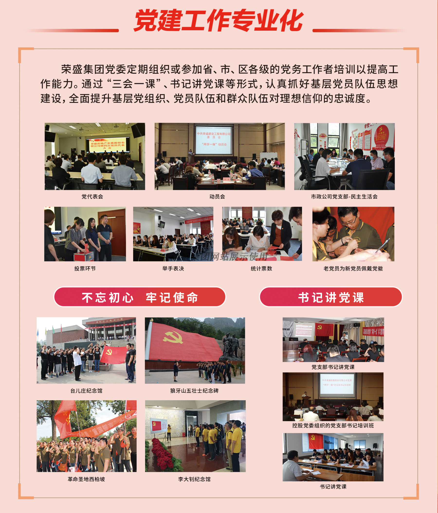 【概要描述】中国共产党荣盛房地产发展股份有限公司委员会、中国共产党荣盛建设工程有限公司委员会和中共荣盛盟固利新能源科技有限公司委员会三个二级党委,36个党支部,党员1313名.其中研究生及本科以上学历党员占比87%,女性党员占比为31%。